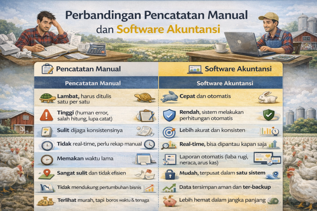 Pencatatan manual cenderung memakan waktu, rawan kesalahan, dan sulit dianalisis. Sebaliknya, software akuntansi peternakan ayam menawarkan pencatatan otomatis, data terpusat, dan laporan instan.